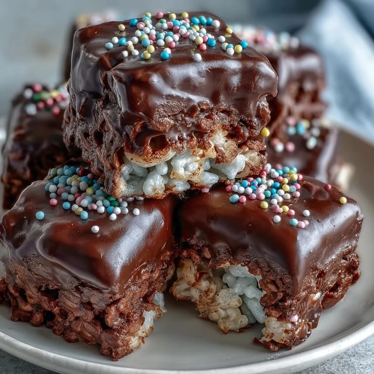 Save My sister showed up one afternoon with a tray of these tucked under her arm, and I couldn't stop at one. The snap of chocolate giving way to that sweet, airy crunch underneath felt like childhood and celebration all at once. I'd made plain Rice Krispy treats plenty of times, but adding that chocolate shell turned them into something people actually asked for by name. Now I keep the ingredients on hand because they disappear faster than anything else I bake.