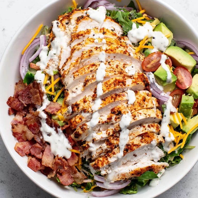 - Top with sliced chicken and bacon then drizzle with ranch right before serving.