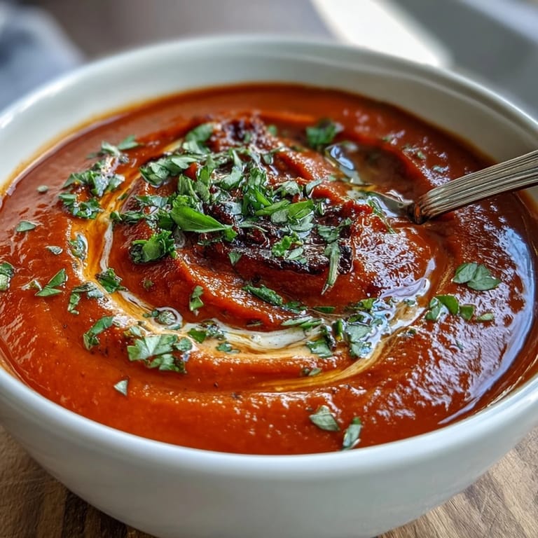 Save There's something almost magical about the moment you pull a baking sheet of charred red peppers from the oven—the kitchen fills with this sweet, smoky perfume that makes everyone pause and ask what you're making. I discovered this soup on a grey afternoon when I had four beautiful peppers sitting on my counter and absolutely no idea what to do with them, so I roasted them on instinct. What came out was this silky, jewel-toned soup that tasted like summer had been concentrated into a bowl, with just enough harissa to keep things interesting without overwhelming the delicate sweetness of the peppers.